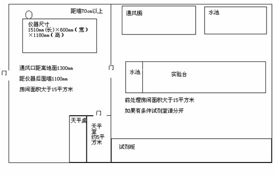 ICP-2000型ICP掃描光譜儀的外形尺寸為1510mm(長)×600mm(寬)×1180mm(高),重量為300kg ,發貨時四角裝有減震器,儀器運到用戶后卸下減震器,換上螺絲桿,當儀器選好位置后,將螺絲桿旋出使四角輪懸空,調節螺絲桿使儀器至水平,為保持儀器性能穩定及便于維護,ICP-2000 周圍必須留出供維護人員維護儀器所需的空間(安裝臺距后面墻面至少70cm)
