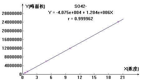按照硫酸根各濃度點依次進樣,計算其峰面積,以濃度和峰面積繪制標準曲線,線性相關系數為0.99996,結果詳見圖1。