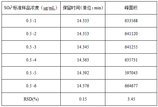 硫酸根離子標準溶液采用梯度濃度的方式逐級稀釋為0.5μg/mL、1.0μg/mL、5.0μg/mL、10.0μg/mL、20.0μg/mL的標準溶液;詳見表1。