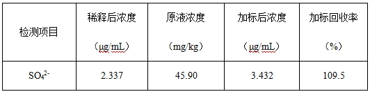 表4 實測六氟磷酸鋰樣品中硫酸根的含量及加標1μg/mL的測定值及回收率
