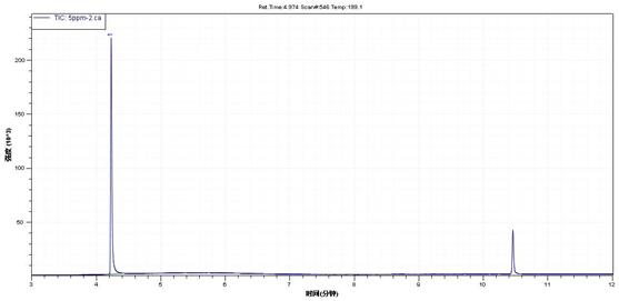 目標物在5ppm-100ppm線性良好。取低含量尼古丁加標,樣品經過乙酸乙酯超聲萃取。50ppm加標水平下譜圖如下,得到了比較滿意的效果。