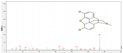 利用罌粟殼生物堿的理化性質(zhì),樣品在強(qiáng)酸環(huán)境下(pH:1-2),采用氣相色譜質(zhì)譜聯(lián)用儀進(jìn)行檢測。采用保留時間和標(biāo)準(zhǔn)質(zhì)譜圖特征離子進(jìn)行定性,外標(biāo)法定量。