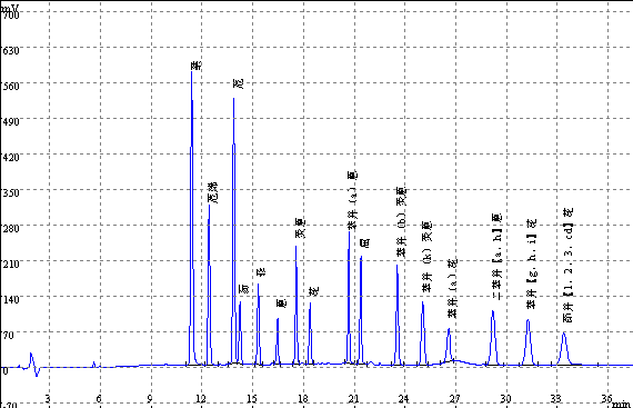 1. 苯 2.甲苯 3.間二甲苯 4.鄰二甲苯 5.正十四烷 6.甲苯二異氰酸酯(I)7. 甲苯二異氰酸酯(II)9.己二異氰酸酯 10.異佛爾酮二異氰酸酯(I)11. 異佛爾酮二異氰酸酯(II) 12.二苯甲烷二異氰酸酯