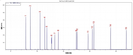圖1 . 15種鄰苯二甲酸酯標準品TIC圖