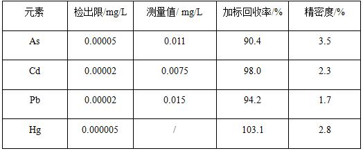 在碰撞反應模式下,以內標法校正儀器信號漂移,將配制好的各元素標準溶液上機測試,繪制標準曲線,各元素標準工作曲線線性相關系數R>0.999;對樣品空白溶液平行測定11次,計算11次樣品空白值的標準偏差,并以三倍標準偏差/工作曲線斜率表示檢出限;間隔2min,對樣品平行測定7次,計算7次測試結果對應的相對標準偏差,表示精密度;對樣品進行加標實驗,并計算加標回收率。各元素檢出限為0.000005~0.00005mg/L,加標回收率為90.4%~103.1%,精密度為1.7%~3.5%。